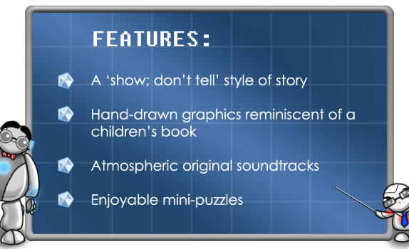 Join this little adventure, solve mini-puzzles and witness the story unfold. Experience a whole new perspective of a post apocalyptic world through art-style reminiscent of a children’s book and delightful soundtracks.