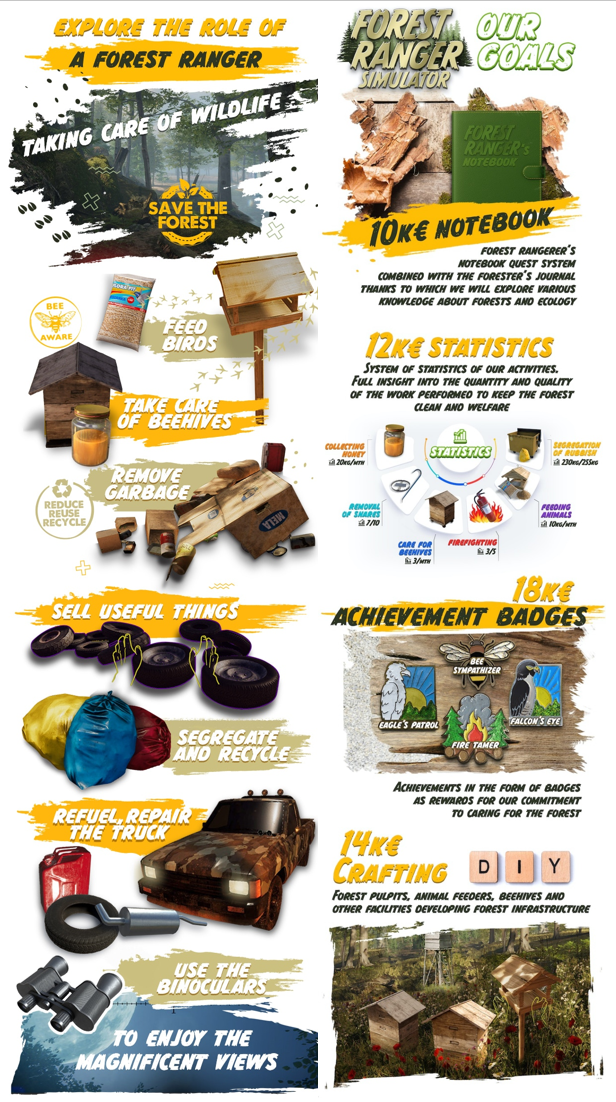 Forest Ranger Simulator is a game, however, we wanted to include as much valuable information from real life as possible in the game. Thanks to the notebook you will learn a lot about the work of a Forest Ranger, you will also find many interesting facts about forests, such as information about mushrooms. Learn by playing. The name simulator obliges.